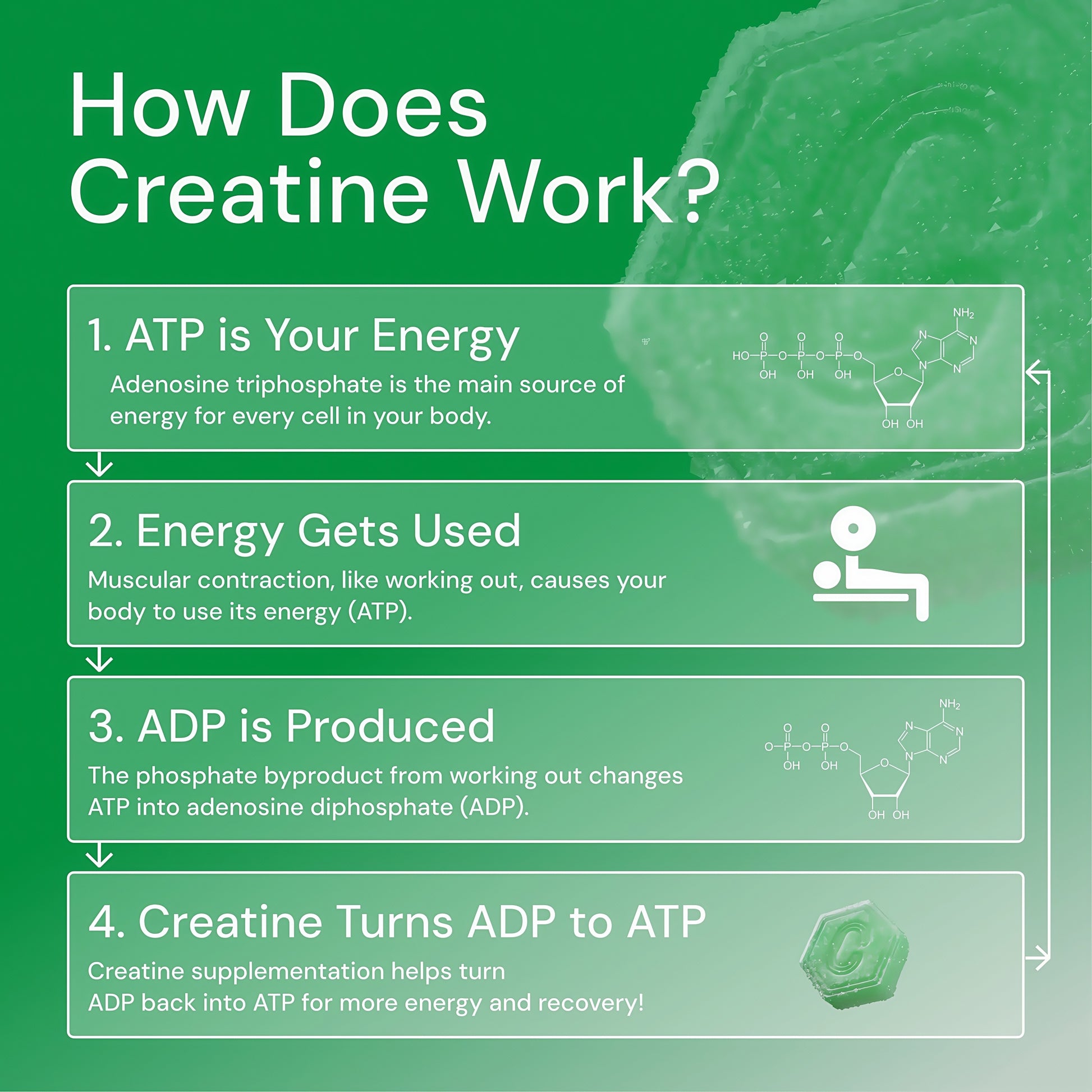 Creatine supplementation increases your body's stores of phosphocreatine, which is used to produce new ATP during high-intensity exercise. ATP is the energy-carrying molecule found in the cells of all living things.
